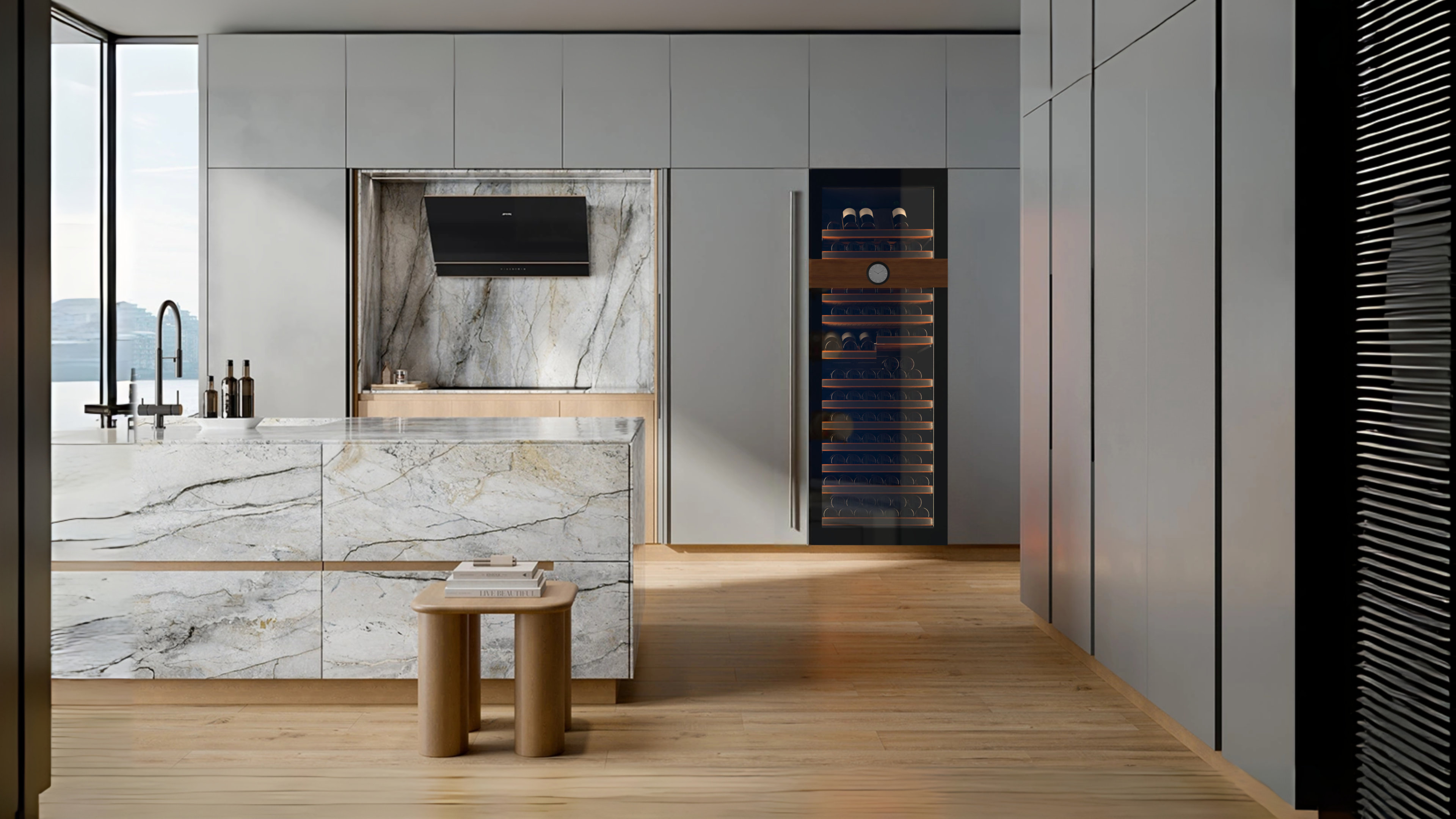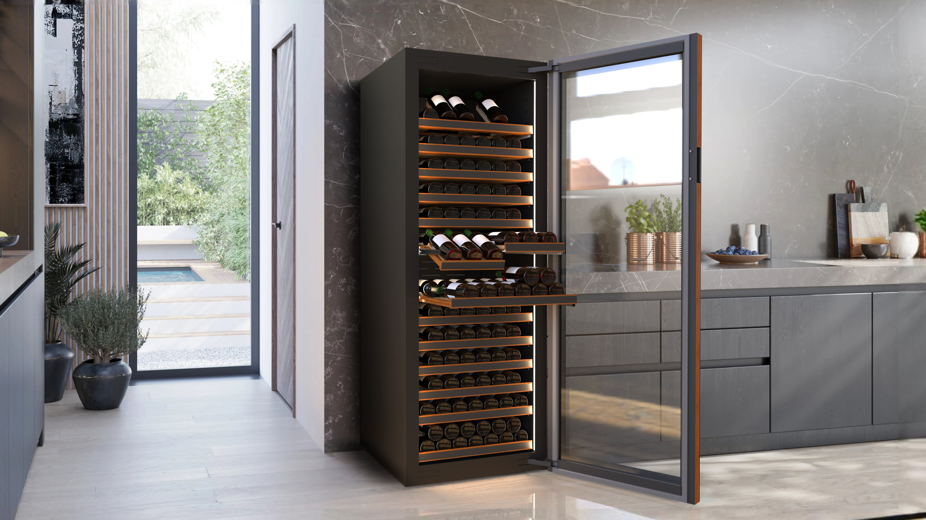 The Hisense wine cooler reimagines many aspects of wine storage and impresses with its single-zone cooling technology, which can be switched to multi-zone cooling at the touch of a button. Perfect for parties or guests with diverse preferences. The centerpiece is the various fully extendable drawers, which can also be converted into presentation drawers with a serving function. Wine bottles can be angled and displayed for special occasions. The cork bottle holders keep the wine secure and vibration-free. A smartphone app allows you to catalog and quickly locate specific bottles in the cooler and even reorder particular varieties. The circular display, set into the wood, blends seamlessly into a sophisticated setting, even in your living room.